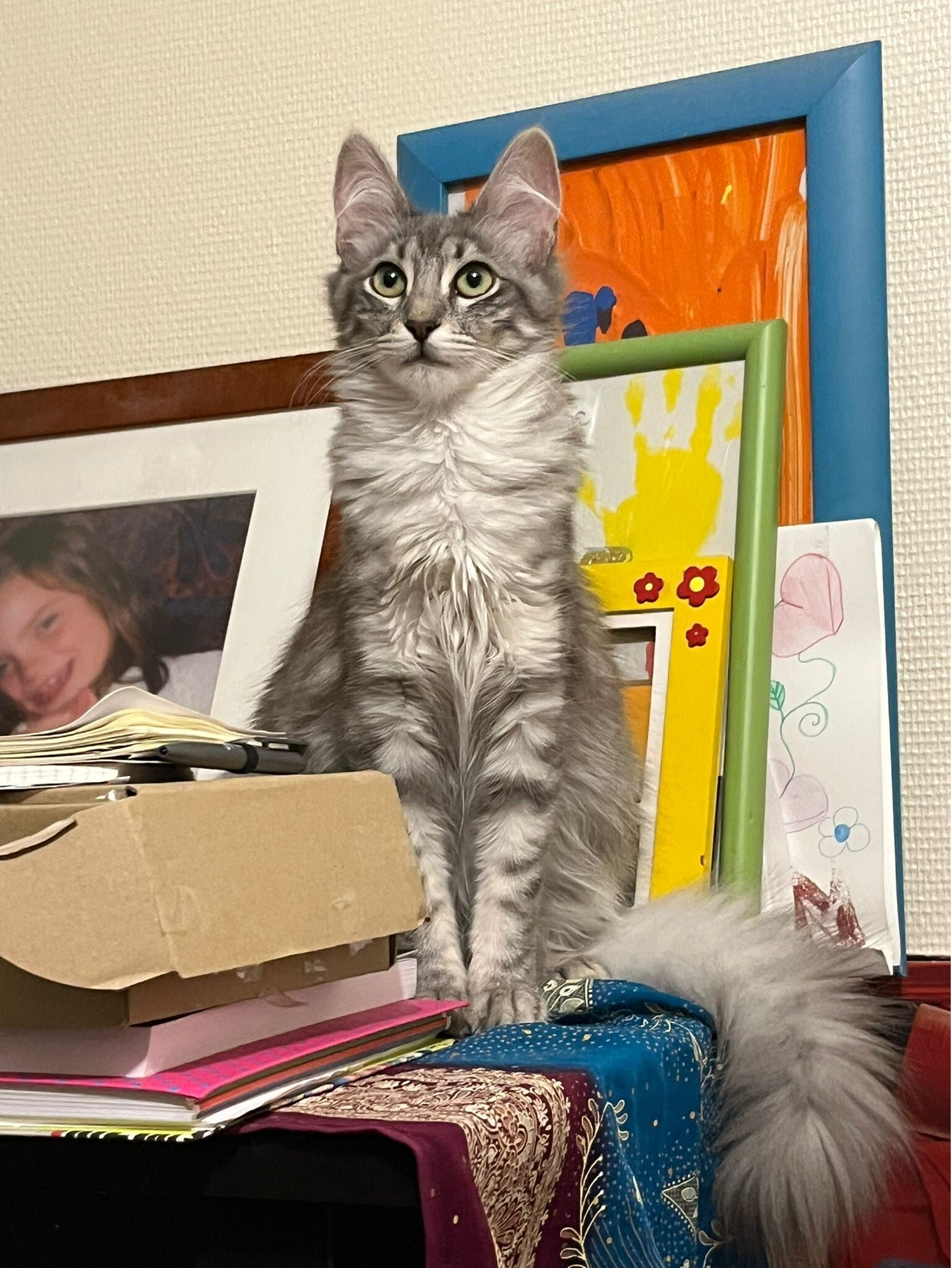 femelle blue silver mackerel tabby, yeux verts Née le 17/07/2024.